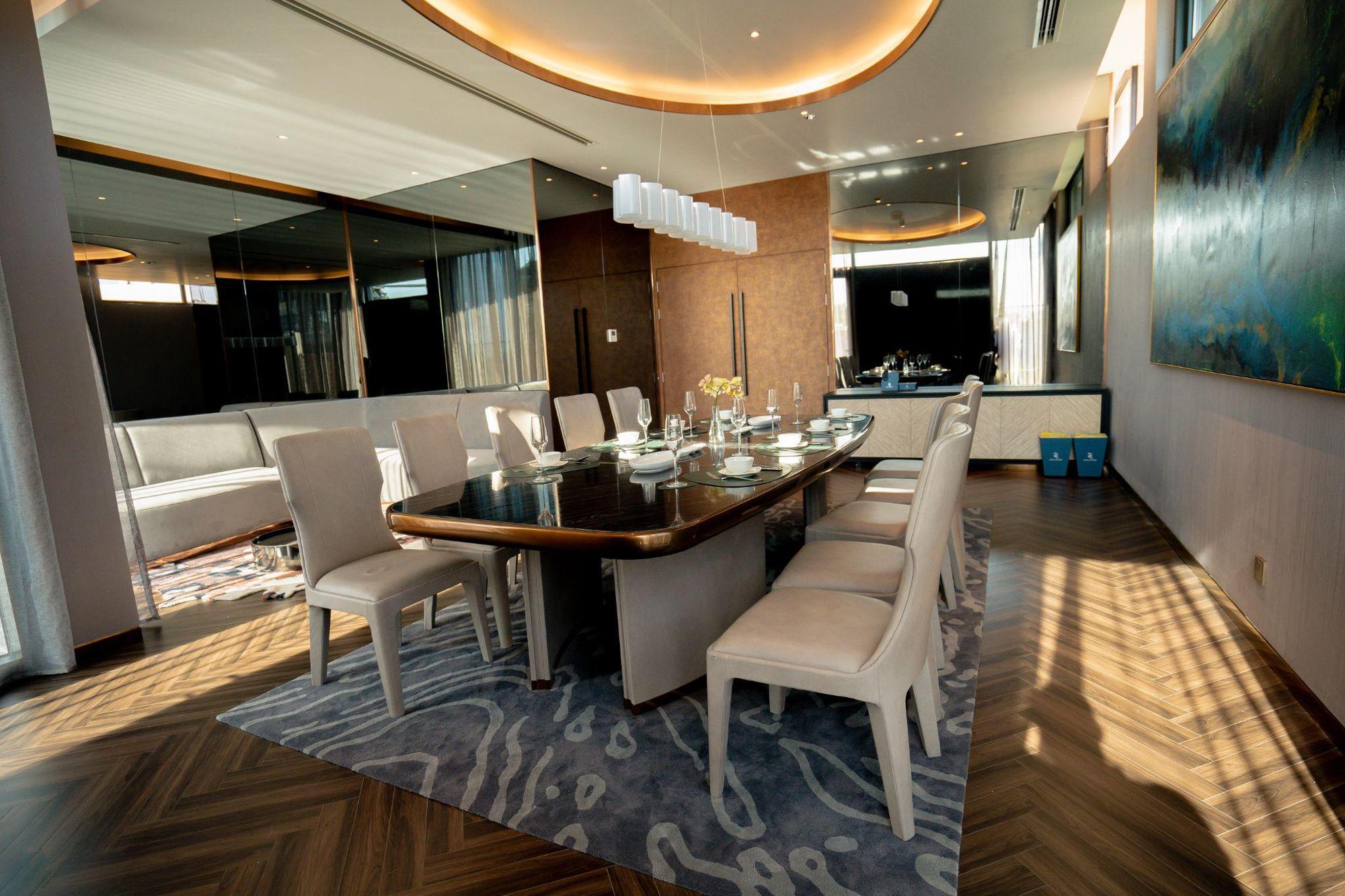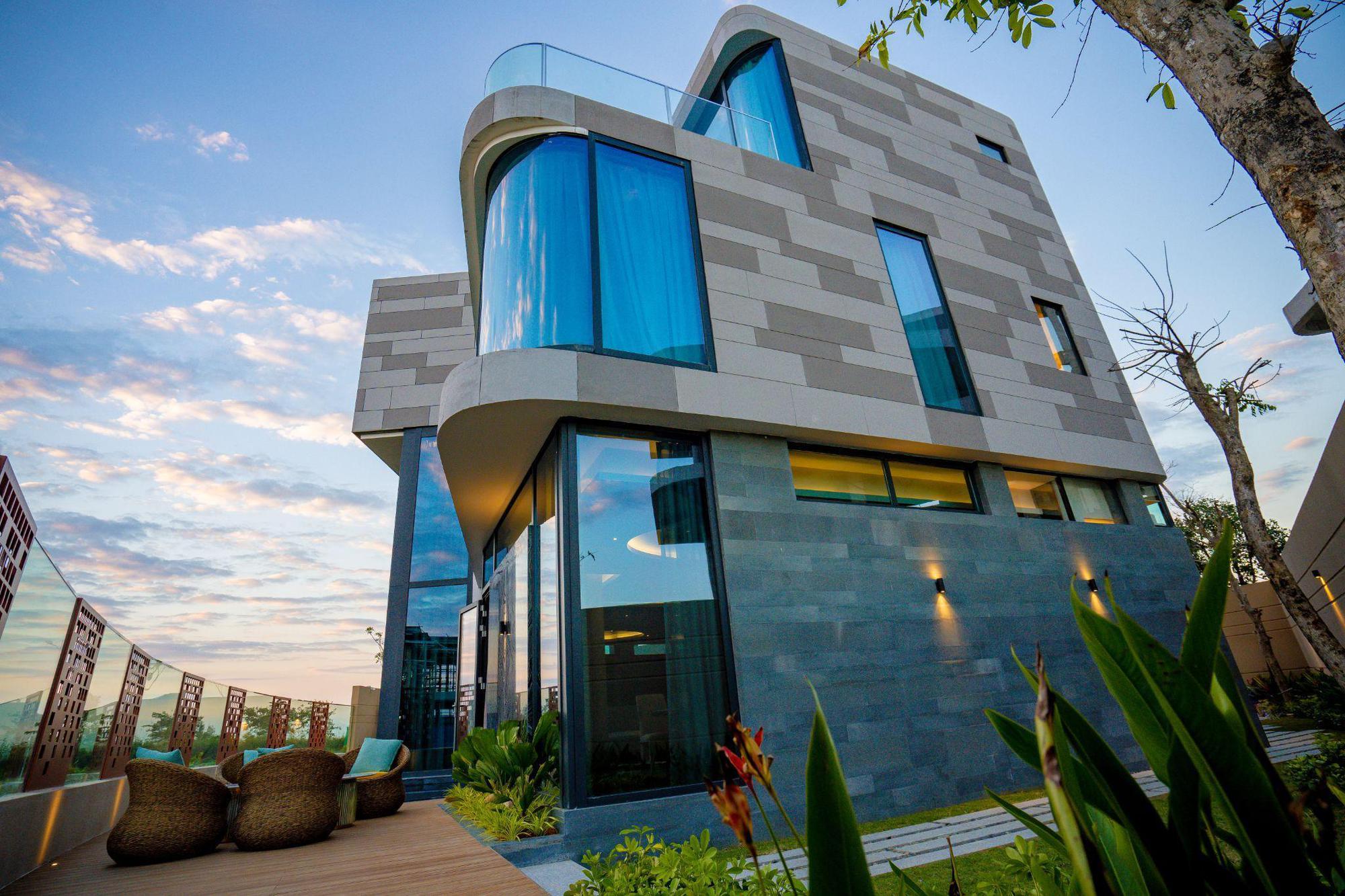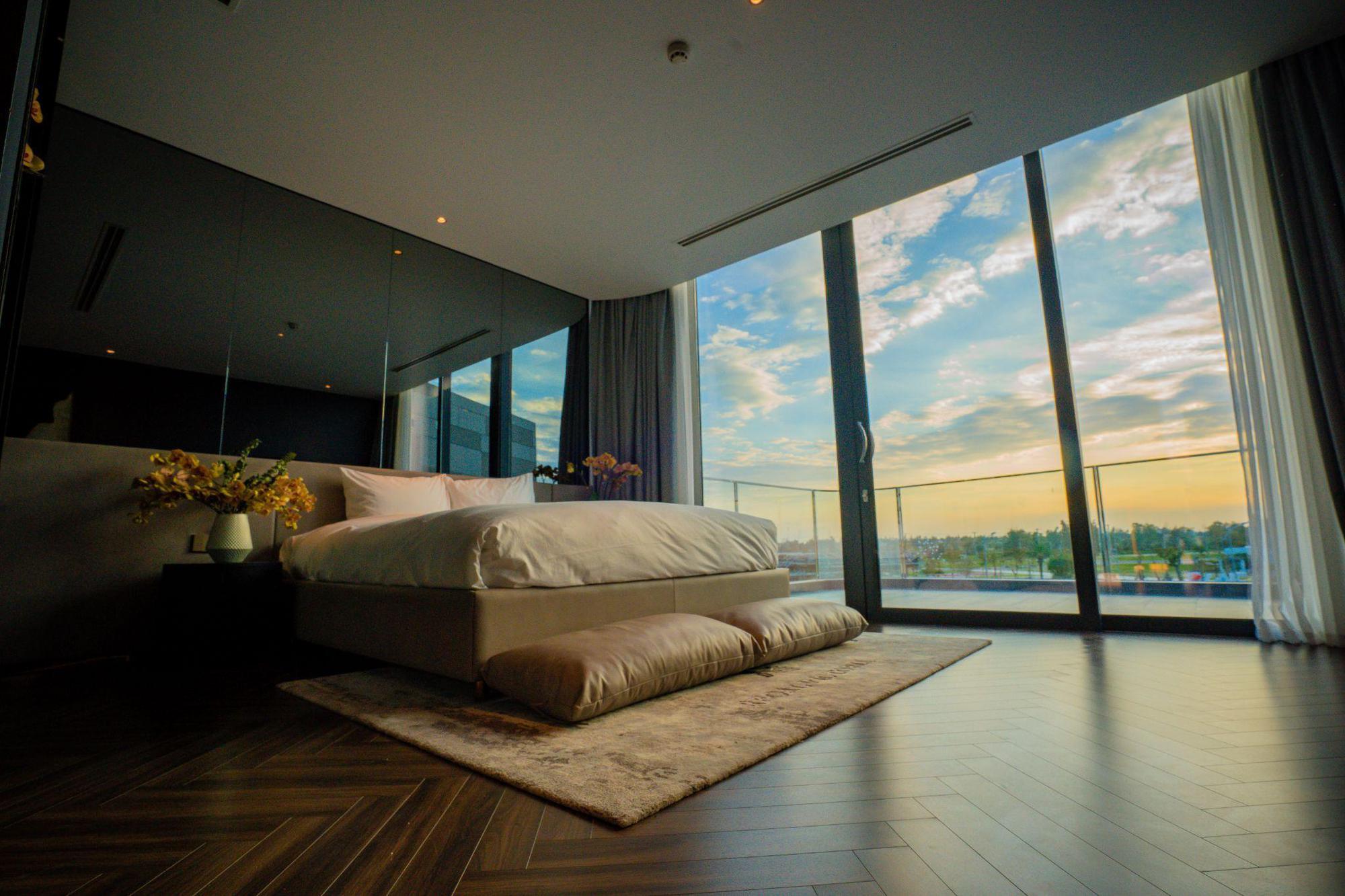 Sự kết hợp giữa hệ kính khổ lớn cao 3m phủ 2 lớp Low E cùng hệ vách nhôm trang trí đến từ Hunter Douglas xử lý triệt để các vấn đề về cách âm, cách nhiệt, loại bỏ tia UV, đảm bảo sức khỏe cho gia chủ tại biệt thự đảo Ngọc Regal Victoria.